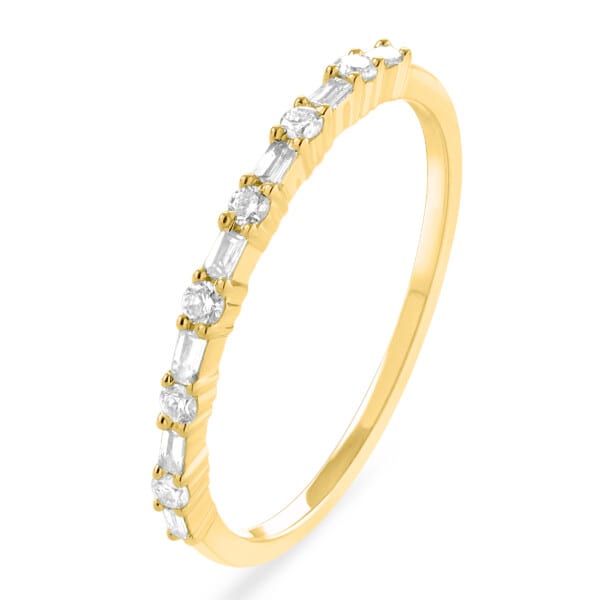 טבעת זהב דקה משובצת יהלומים עגולים ומלבניים בשלוש שורות